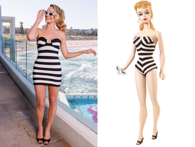 相信有看過《芭比》第一版本預告的朋友們,一定對瑪格羅比身穿黑白斜條紋泳衣,搭配復古白色墨鏡的造型印象深刻,其實這套就是致敬芭比在 1959 年誕生時期的最初造型,而華納兄弟這回直接將澳洲沙灘包下來舉辦派對,瑪格羅比也以 Hervé Léger 的條紋短洋裝亮麗登場,搭配 Jacques Marie Mage 的白色貓眼墨鏡及 Manolo Blahnik 的跟鞋,讓所有資深芭比粉都驚艷不已。