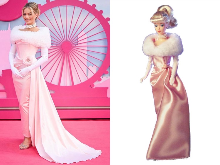 最後則是她在倫敦舉行的《芭比》首映會上,換上 Vivienne Westwood 的粉色絲緞禮服,搭配 Christian Louboutin 的跟鞋,以及 Assael Pearls 的珍珠項鍊,雖然包緊緊好身材依舊藏不住,也完美還原了 1960 年的「Enchanted Evening」芭比,雖然這時的她已明顯看出疲態,但整個團隊的敬業程度依舊讓人折服。