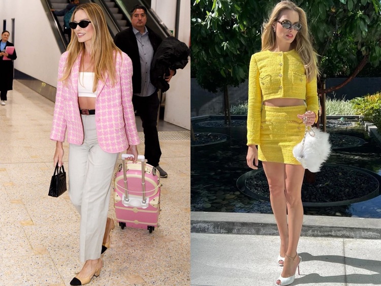 說到夢幻芭比配色,怎麼可能沒有 Chanel!瑪格羅比回到她的家鄉澳洲宣傳時依舊火力全開,在機場就以 Chanel 1996 春夏系列甜美登場,粉色的格紋斜紋軟呢外套搭配灰藍色長褲,雖然跟前幾套比起來相對日常了一點, 但是搭配 SteamLine Luggage 的復古行李箱,也不禁讓人在內心吶喊:造型師沒有要放過瑪格羅比!而在首映會上也換上一身 Chanel 亮黃色套裝,實在美得太耀眼!