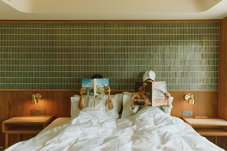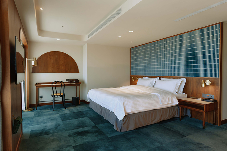 床頭板延續深色木板、小片磁磚和古銅材質讀書燈,以暖棕、青藍與古銅為主軸,旅客們可以自己帶上喜歡的黑膠唱片或是在一樓服務櫃檯免費租借,使用房間內的黑膠唱片機,播放溫暖音感的音樂。浴室則使用磨石子地板與墨綠色大理石流理檯面,搭配使用歐洲進口品牌沐浴備品。客房部分,使用北美進口SPF原木床座、強化人體工學的專用彈簧床墊,同時也貼心準備兩種不同硬度的枕頭。