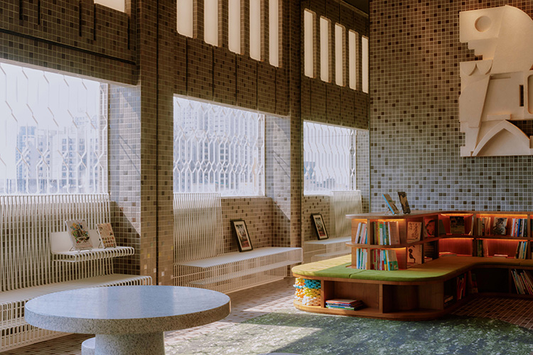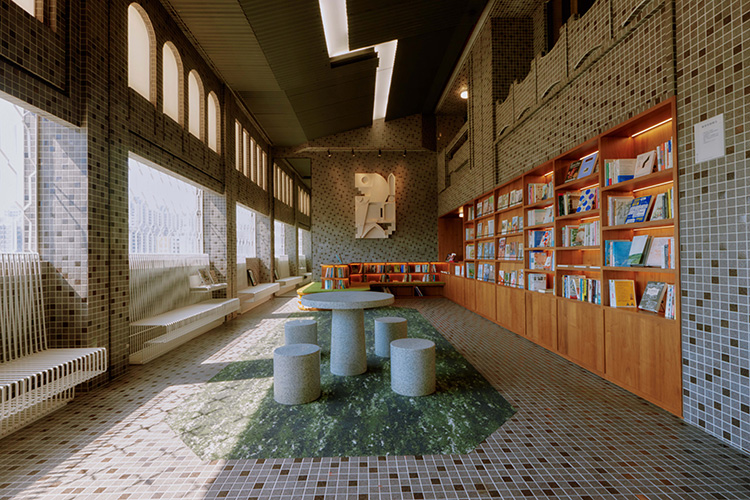 8樓則還有提供給旅客的公共遊憩空間,包含:圖書館、會議室、懷舊遊戲區、自助式洗衣、景觀健身房、廚房吧檯區。圖書館的收藏邀請誠品為大小朋友選入與台南在地相關主題的書籍,導入BOVEN雜誌圖書館,每月精選與旅行生活、時尚、設計相關的外文雜誌,可以待在圖書館翻閱,或是拿回房間閱讀。特別利用鐵件座位、公園中會出現的家具、磁磚立面模仿半戶外與民宅交錯感,猶如穿梭在台南的後巷。