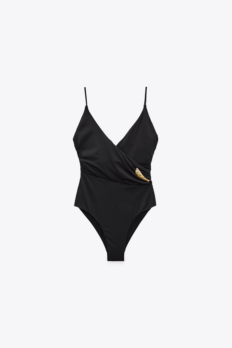 冬天吃出來的小肚子還沒消下去嗎?選擇黑色泳裝給你最修身顯瘦的效果!復古V領連體泳衣,不管是沙灘或是泳池都完美通殺。搭配一個金色綴飾於腰間,不僅幫你拉高了腰線比例,不對稱的設計在視覺上也會更顯瘦。(官網建議售價:NT$ 1,490。)