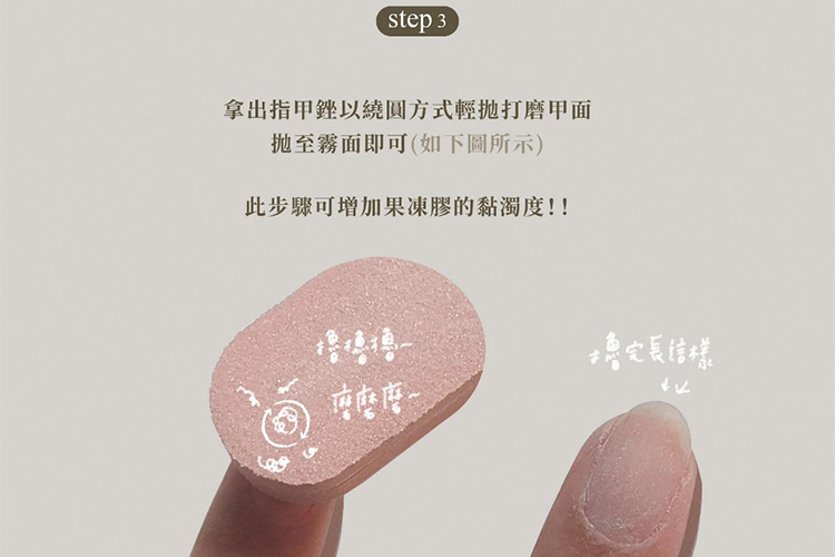 接下來一樣拿出店家附贈的指甲挫,以繞圓的方式打磨甲面,因為每個人的甲面都有不平整的紋路,必須將紋路磨平,才能更好的讓膠完整黏著在我們的指甲上,記得只要磨成霧面的樣子就好,這樣就不用擔心會傷害到真甲。