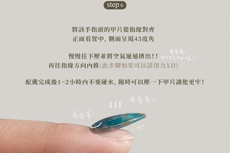 這步驟建議可以直接將手轉成側面進行,將甲片對齊指緣,確定置中後,將甲片與甲面呈現45度角,慢慢往下壓同時,也要記得將空氣擠出來,再往指緣的方向"用力"往後推,就擁有美美的指甲啦!配戴完成後,要注意2小時內不要碰水,然後每天想到就是一直壓~壓~壓~甲片,讓它牢牢地黏緊指甲喔!