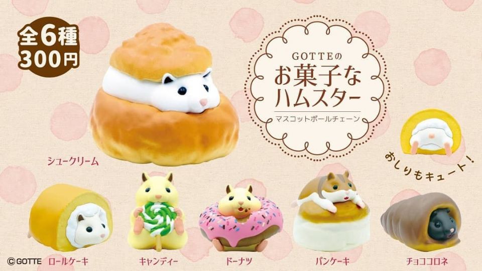 由助六的插畫師GOTTE所畫,六款隱身在甜點裡的小倉鼠扭蛋,樣子真的好可愛呀!肥肥臉頰,一臉貪吃的樣子,鼠鼠跟甜點怎麼可以這麼搭!小編等不急希望台灣扭蛋店也能趕快上架!