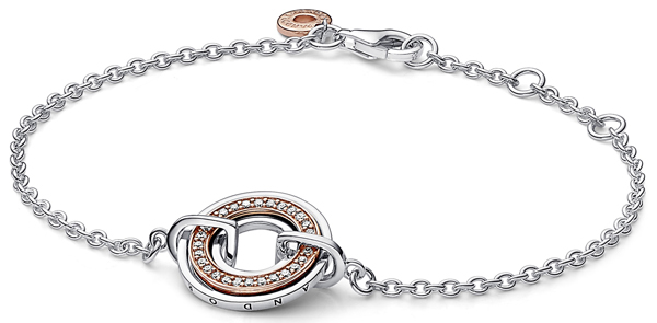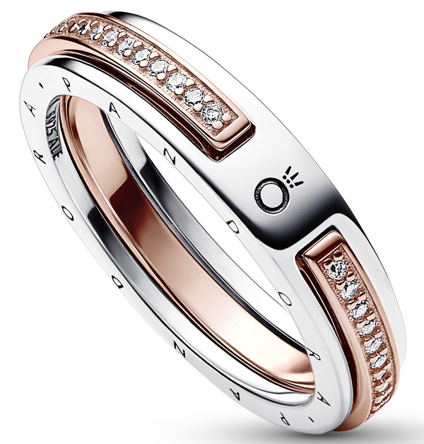 首次推出的雙色金屬設計「Signature I-D」密鑲寶石手環,含蓋窄版及寬版尺寸,材質選用925銀結合鍍14K玫瑰金及密鑲寶石,散發絢麗奪目的璀璨光芒,「Pandora」標誌的字母被均勻地低調鑄刻於手環側沿,每個字母皆對應手環上細膩鑲嵌的長方形切割寶石,於細節處體現高雅大器。可搭配現有的開放式或圓環式手環,打造出色的時尚疊戴造型。