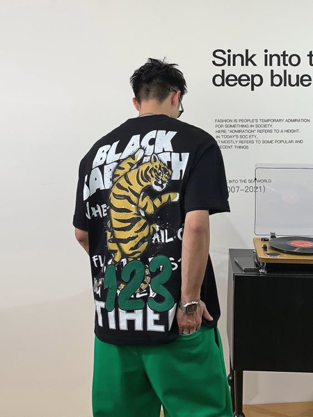 徐太浪國潮黑色短袖T恤將帶有中華文化的元素融入服裝設計中,背後的老虎圖案使用水彩的筆觸加上富有童趣感的設計,帶有衝突美感,讓人眼睛為之一亮,加上類塗鴉風格的文字與數字搭配,整體街頭潮流感十足,輕鬆搭配個短褲加上鴨舌帽,就能讓人街頭感爆棚,相當有型。