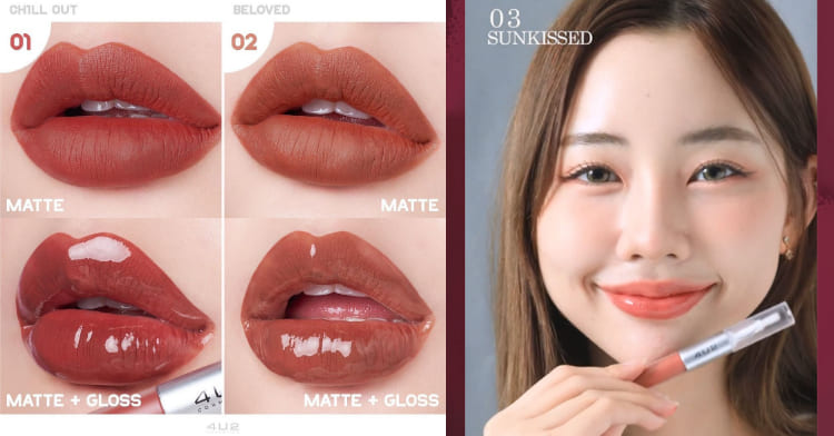 泰國國民人氣彩妝品牌4U2,這次的唇彩作品也絲毫不讓人失望!將霧面、水感兩種妝容需求二合一,打造霜頭設計的獨特唇彩單品。一端為柔霧質地,唇彩的顯色度佳、長效持色。而另一端為水感透明質地,擦上即有一層薄膜的水光觸感,只要一支就能滿足妳多種妝容追求。