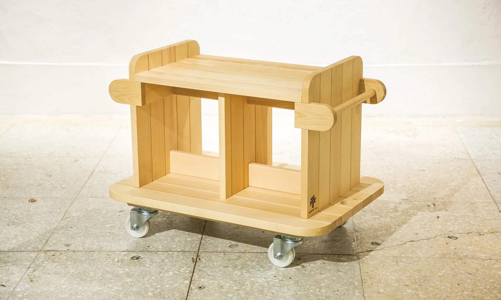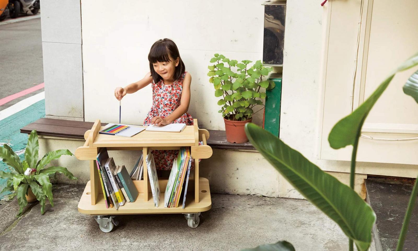 除了設計座與站的家具系列,「觀察の樹」更打造了一款可以「移動」的書櫃 Kino Schola 移動圖書館,Schola 是拉丁文「學校」之意。讓閱讀這件事變得更輕鬆、自由,可以隨時營造出一個屬於自己的讀書空間,可以收納一百多本紙本書。此外,它能夠承重一百公斤,大人或是小孩都能倚坐在書櫃上面。