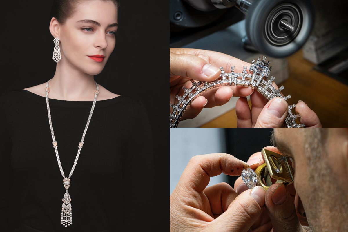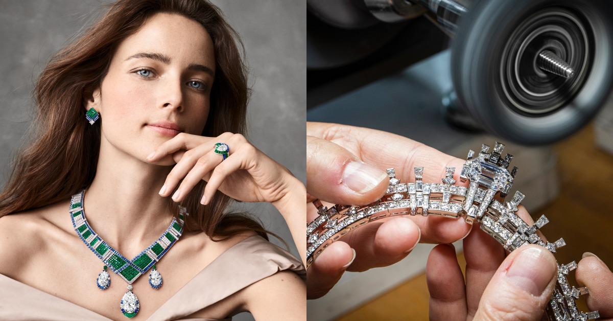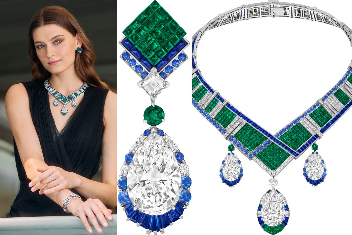 「Chevron Mystérieux」系列是其中一個代表作,其設計靈感來自於1950年代的時裝。清楚可見的三顆碩大梨形切割鑽石,中間重逾31克拉、另外兩顆分別重12.18和12.07克拉,具設計感且耐看的圓潤外型,富有重量感卻不厚重,藍寶石和Mystery Set隱密式鑲嵌祖母綠互相輝映,襯托於方塊切割的項鍊之上,此外,這件作品更多達六種變化,中間的圖騰可化作吊墜,懸於鍊條上,而另外兩顆鑽石亦可點綴耳環,這多變性的組合,帶領作品進階到另一個新層次。