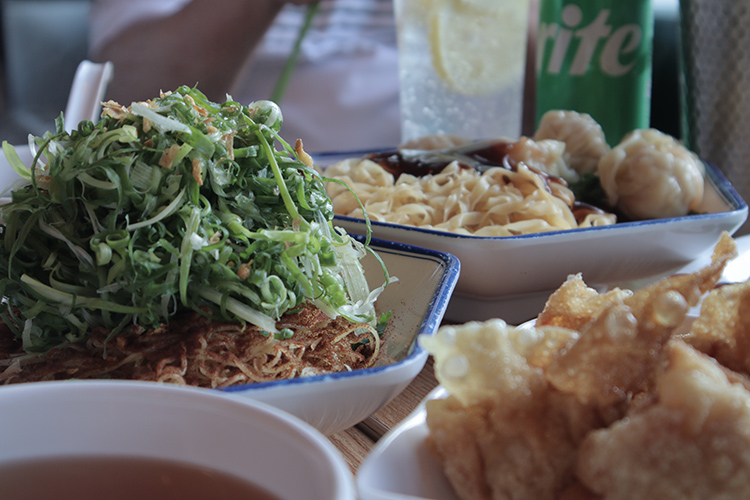 其中,最推薦一定要吃它們家的「蝦子薑蔥撈麵」一上桌滿滿的青蔥搭麵條以及一碗清湯,店員推薦可以單吃或是把湯倒下去變湯麵,你可能會疑問「蝦子呢?」,不太確定蝦子是融入到麵條裡還是上面紅棕色的粉,一入口你便能感受到濃厚的蝦子鮮味,配上青蔥一點也不單調,反而會讓你忍不住一口接著一口,你也可以選擇拼牛肉、水餃或是雲吞(餛飩)。