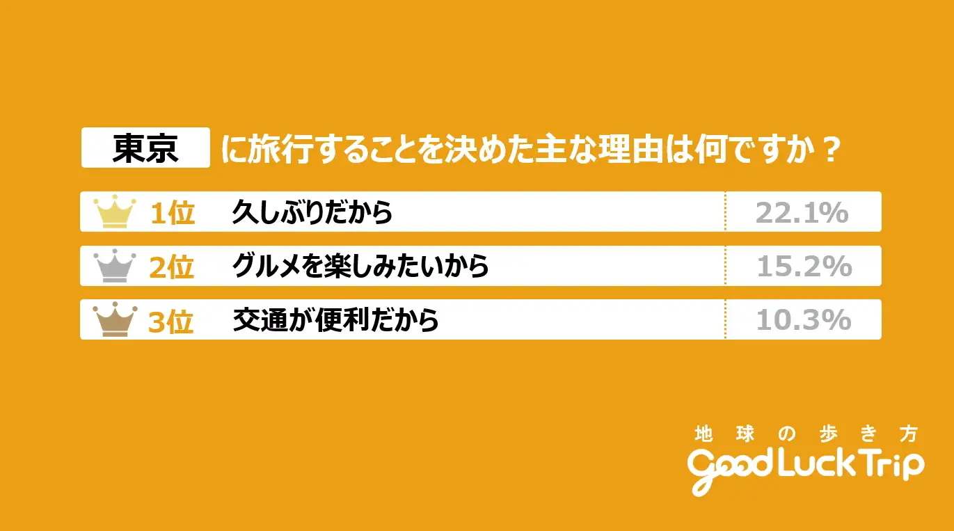 前陣子,日本旅遊網向國外網友提問,如果你暑假有計劃來日本,你最想要來哪裡?這份問券有超過 400 多人參與,表示今年夏天一定會去,並勾選自己想去的地方。有 33% 的國外選擇「東京」,成為大家最喜歡去的地方,但詢問原因:有 22.1% 的人表示是因為「太久沒去了」,有 15.2% 的人表示是因為「很喜歡這裡的食物」,有 10.3% 的人表示是因為「交通便利」。