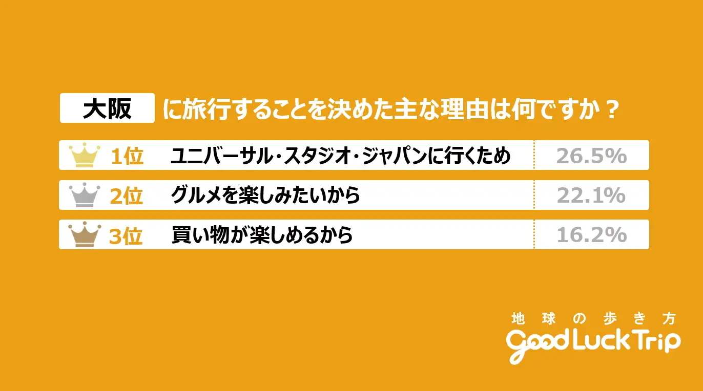 國外遊客第二名最想去的地方是「大阪」,有 26.5% 的人想去的原因是「想去環球影城」,有 22.1% 的人想去的原因是「想品嚐美食」,有 16.2% 的人想去的原因是「喜歡在這裡購物」。