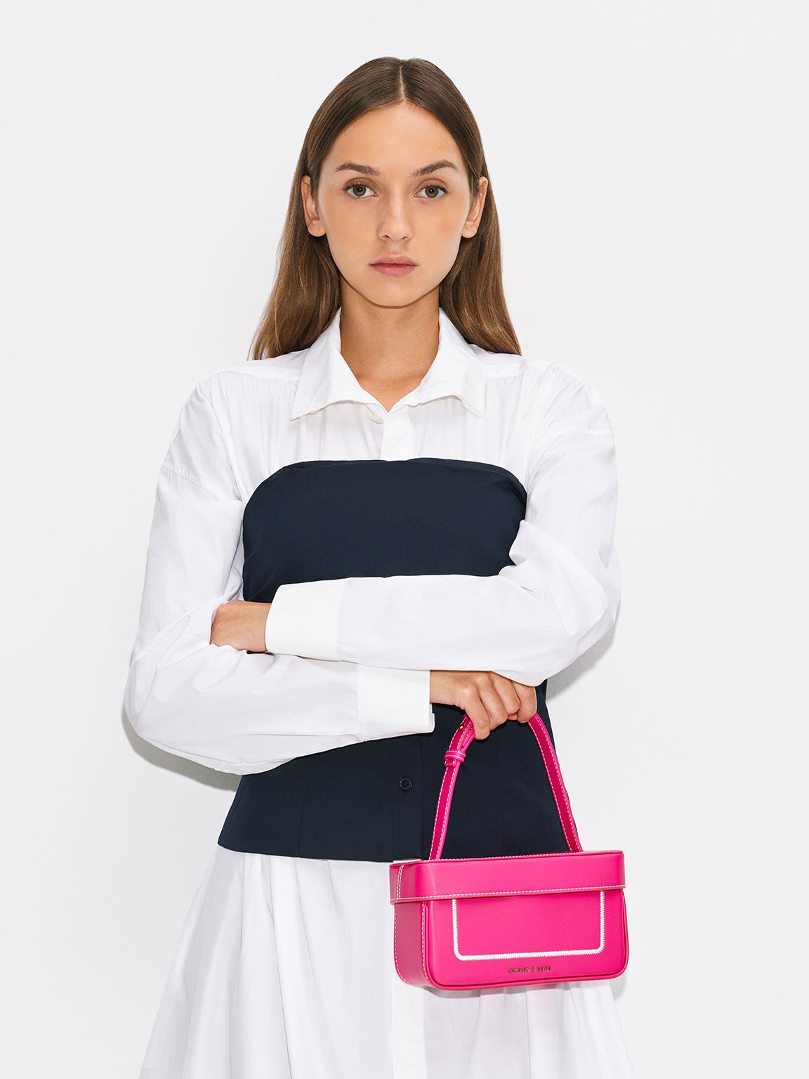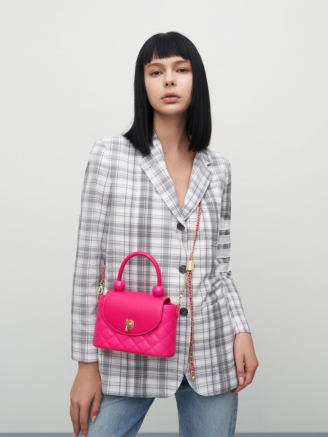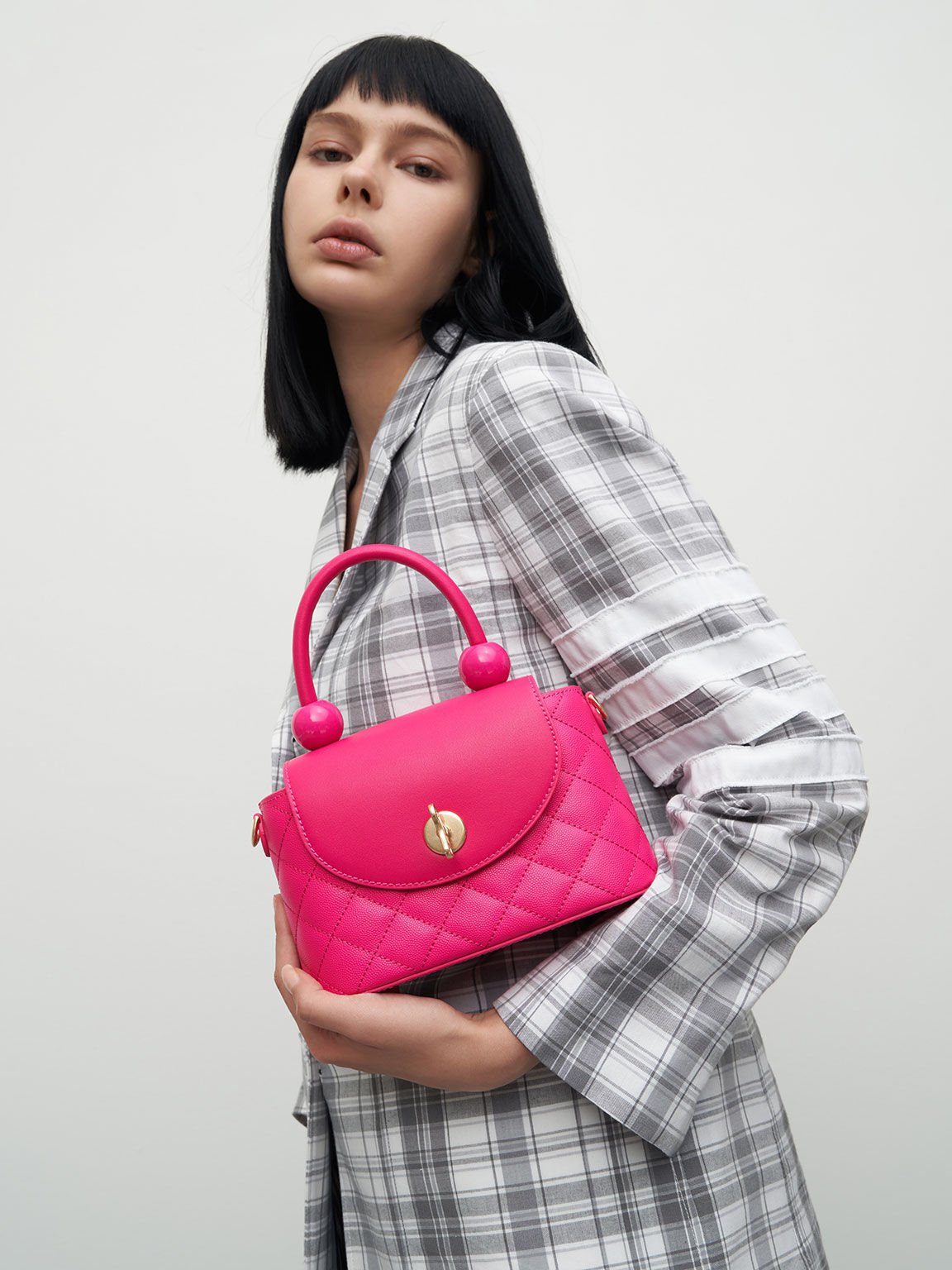 Charles & Keith 小巧亮麗的桃紅菱格箱型手提包,特殊的提把造型與柔軟的菱格紋皮革,還有發條造型旋鈕,以及可拆式鍊條皮革背帶,完全就是芭比公主的日常穿搭配備,時尚造型讓你輕鬆展現最時髦的Y2K風格!