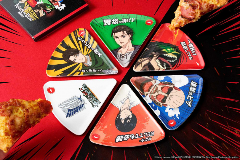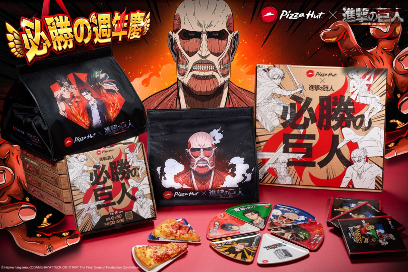 即日起只要訂單滿400元加價99元就可以抽「進擊の三角盤」角色盲盒,全台限量2萬個。6款設計特選了人氣調查兵們:艾連、米卡莎及里維兵長,還有9大巨人中的超大型巨人及始祖巨人等重要角色。另一款「熱血の保溫袋」全台限量8千個,以主角艾連及超大型巨人為創作發想的雙面保溫袋,想要外帶必勝客大比薩時拿著它就對了,絕對是身為鐵粉不能錯過的超實用生活小物。