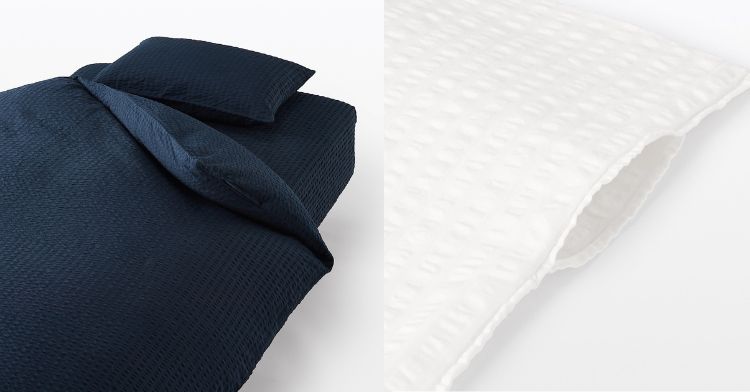 睡覺怕悶熱的人首推「棉凹凸」材質,躺上去直接少三度,涼爽又蓬鬆的觸感是夏天必備的床包!採用特殊的縱向凹凸織法,能夠減少與肌膚接觸面積,讓空氣流通帶來涼爽的體驗。「棉凹凸」一樣使用有機純棉製造,要注意的是這個材質的延展性比較低,日本寢具規格較窄,所以尺寸選擇一定要確認,避免買回家無法使用。