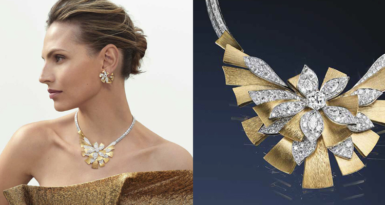 「Le Jardin de Chaumet」系列邀約儂粉們一起品味閒庭信步的妙趣、呈現來自世界各地的愛情花、玉蘭和菊花之中。最後,第四篇章「花花世界」,乃以現代手法見證其出眾的探索精神,促使品牌與眾不同,以一種溫柔的遐想豐富了漫步的樂趣。以鎏金燦爛和璀璨鑽石交織而成的「Magnolia(木蘭花)」珠寶套組,完美呈現出Chaumet在金工造詣上的細膩工藝。18K黃金葉片上手工刻鑿細緻紋路,與鑲鑽花瓣交錯,形成富有張力向外綻放的花朵,造型立體生動,亦能舒適輕鬆的佩戴。其非凡的光芒也體現同套組的耳環及戒指上。