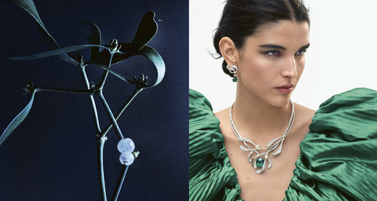 旅程始於茂密的樹林,槲寄生和蕨類植物…等最不起眼的物種與雄偉的樹木。在第一章中,Chaumet以獨到的植物學視角審視茂盛綠植,重新演繹這些乘載回憶與象徵意義。當中一條以「槲寄生」為創作的祖母綠項鍊,乃由兩條鑲嵌鑽石的緞帶交織而成,柔美的線條幻化成槲寄生繾綣交織的葉蔓,並點綴結實壘壘的珍珠。主石部分則是鑲嵌上了一顆重達21.59克拉的枕形切割哥倫比亞祖母綠,濃郁飽滿的綠色,襯托此件作品純淨簡約之美。