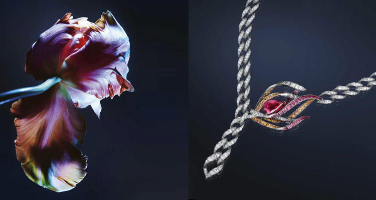 由Chaumet構築的花園既迷人又廣闊。走過環繞樹林的田野,步行者遇上競相綻放的四種名花:三色堇、鬱金香、鳶尾花和海芋。在這第三章節中,花卉的色彩彰顯在品牌設計語彙中佔據重要地位的色彩美學。但儂編我這邊最想提到一條鬱金香造型的項鍊,此條項鍊設計特別之處又在於,它並不是全然表現出花瓣的柔美狀態,反以鑲上鑽石的粗鏈條去襯托、結合,使其展現出充滿個性的現代花卉風格。
