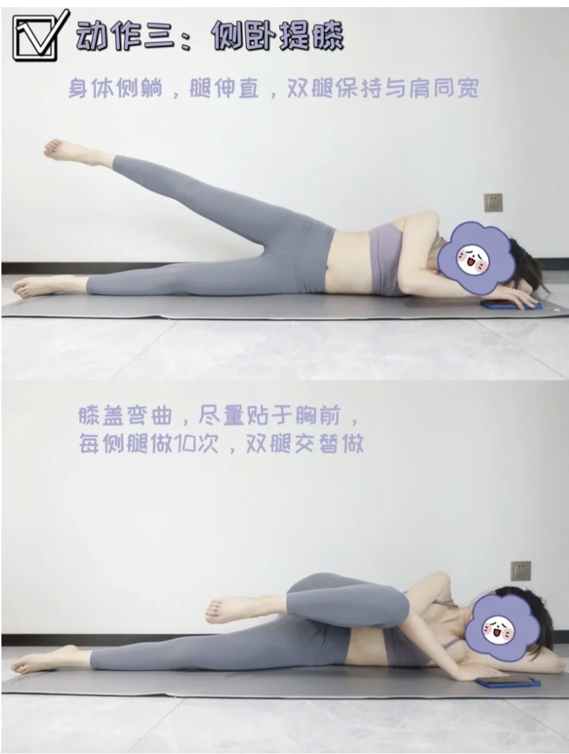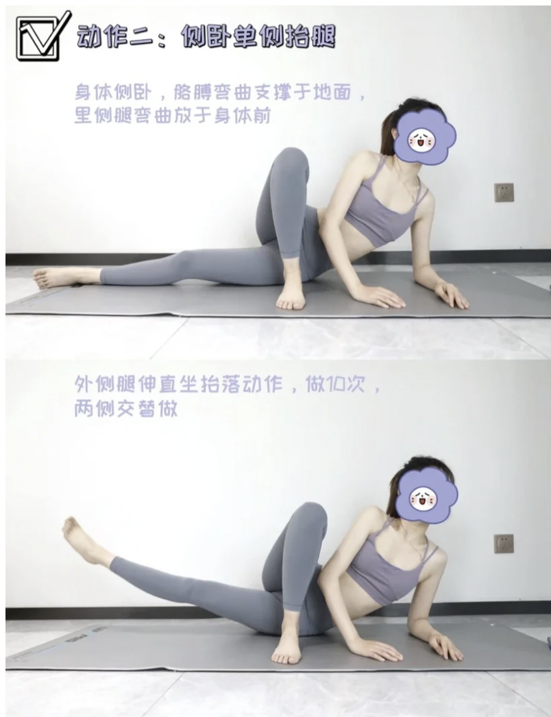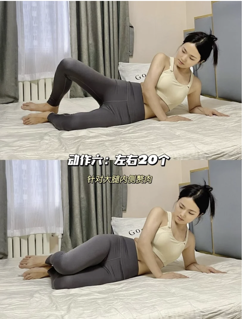 這個動作能有效緊實大腿根部內側。每組做10下,做3-4組。雙腿交替進行~