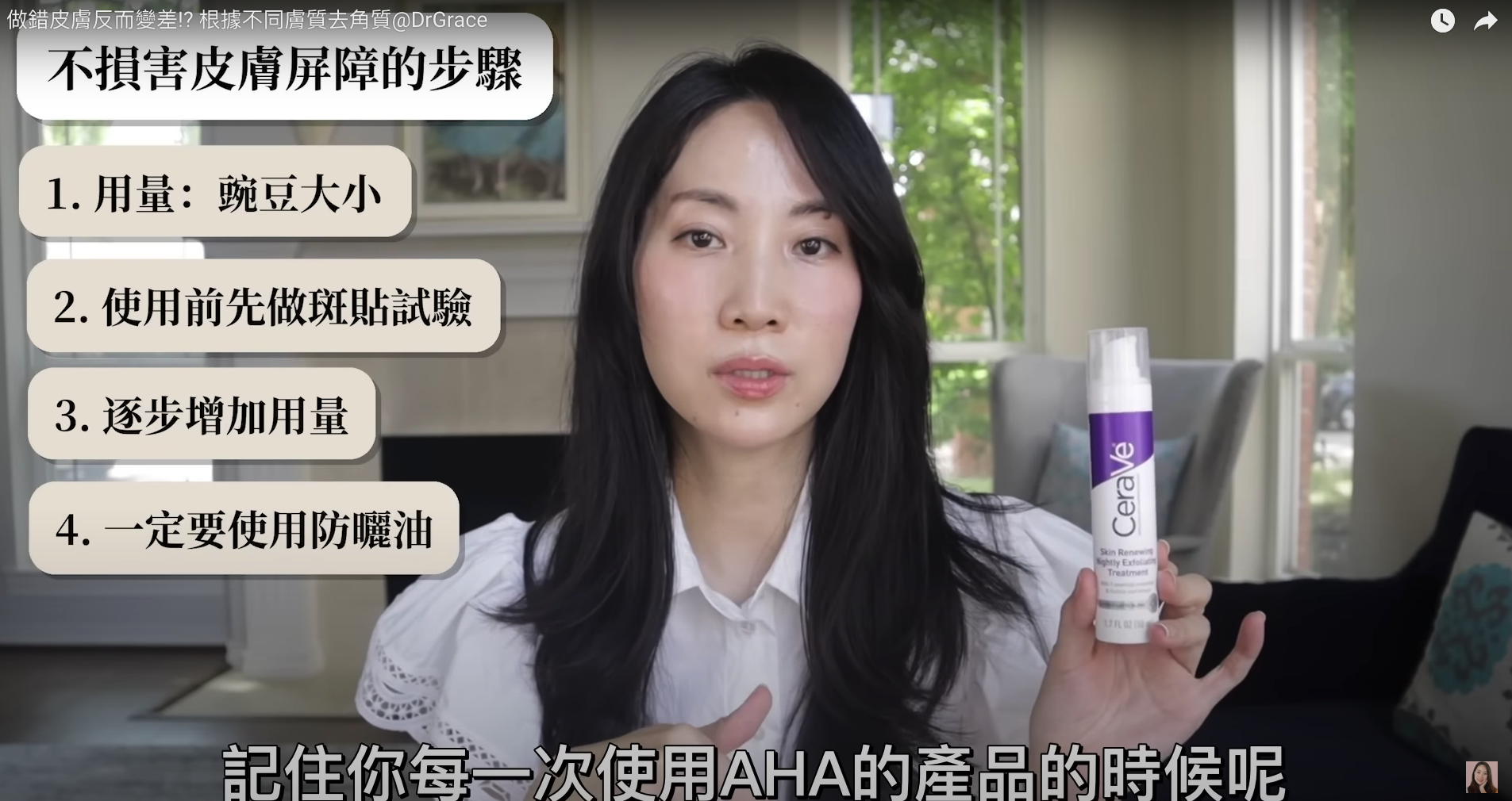 AHA內含的甘醇酸與乳酸都能對乾性肌膚造成很大的幫助,它雖然是酸類,但也同時是保濕劑,能幫助乾性肌膚做到肌膚鎖水的效果,Dr.Grace推薦給乾性肌膚的去角質產品是「cerave適樂膚 煥膚系列 夜間去角質精華液」