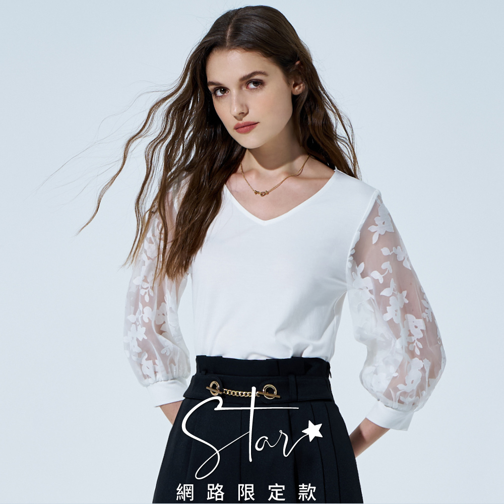 SO NICE STAR知性透膚造型袖上衣是網路限定款式,拼接透膚花朵圖案造型袖,微微的透膚設計散發出性感氣息,白色上衣百搭又實穿。搭配短褲、短裙,很適合OL夏天上班穿,下班穿去約會也沒問題,回頭率超高。V領設計,輕鬆展現鎖骨、修飾臉型,是很多女生會特別挑選的衣服版型。