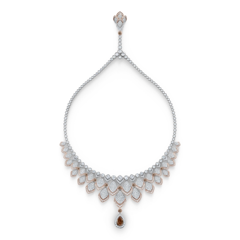 以一片片鑲鑽的花瓣平鋪排列隨墜於胸前,巧妙結合18K白金與玫瑰金、搭配高達3.02克拉的梨形切割褐橘鑽,靈動輕盈的花瓣,隨著配戴者的一靜一動,耀眼奪目。