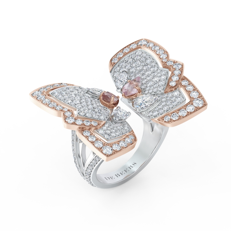 蝴蝶造型戒指,18K白金與玫瑰金結合,並鑲嵌2顆粉紅色鑽石原石,此作品更附上鈦金屬材質的外套,呈現出兩種配戴方式,實現了本系列所要著重的多變的搭配性。