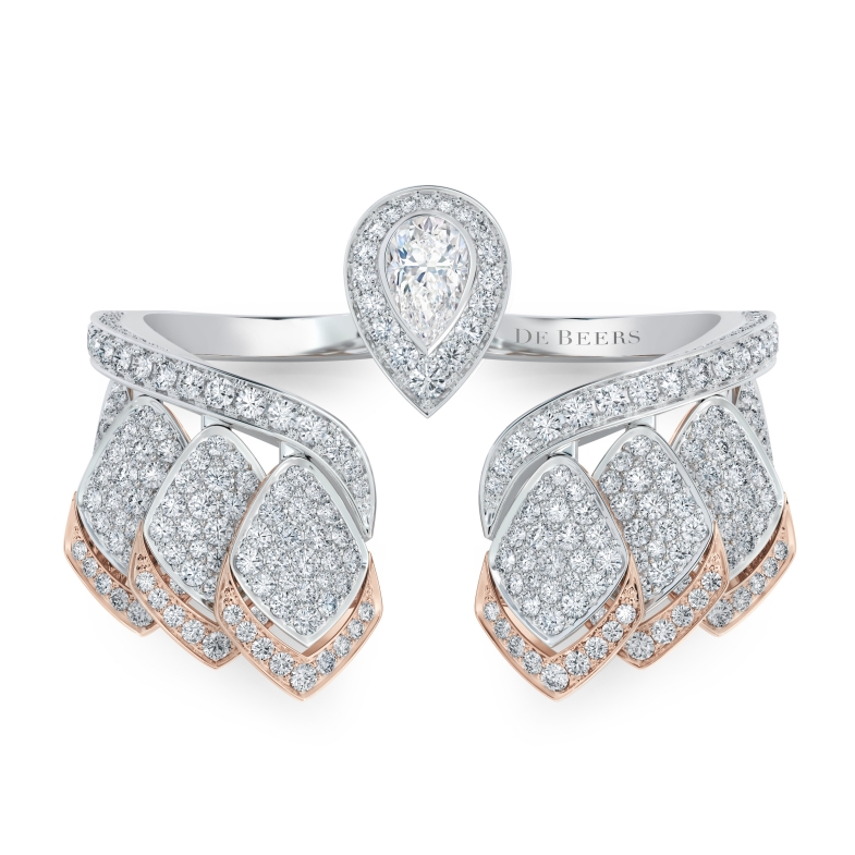 結合18K白金與玫瑰金,模擬出花瓣上的漸層色調、搭配0.7克拉梨形切割白鑽,主鑽置於中央,聚集眾人目光。
