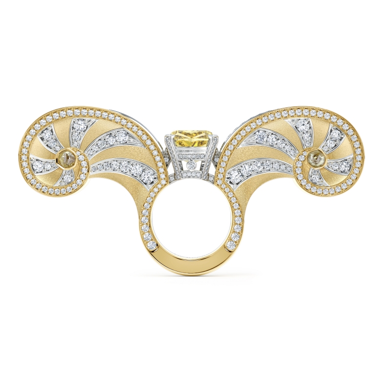 此作品高達四種配戴方式,7.61克拉的枕型切割豔彩黃鑽單戴就超醒目,戒指外套側面更呈現出蝴蝶展翅飛舞的模樣,不管哪一種配戴方式都是亮點,體現了品牌的大膽創意,不只是珠寶,更可稱之為藝術品。