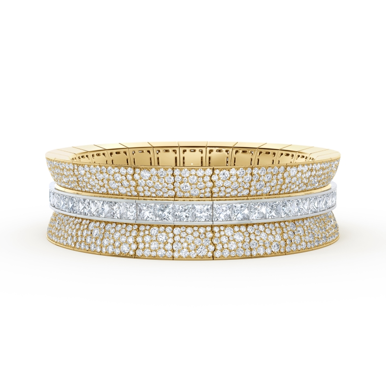不規則的雪花鑲嵌鑽石,沿著中間白金夾鑲方型切割的鑽石,彷彿模擬了生物化石的脊椎,巧妙的解構設計,提供配戴者可以輕鬆滑動於手腕間。
