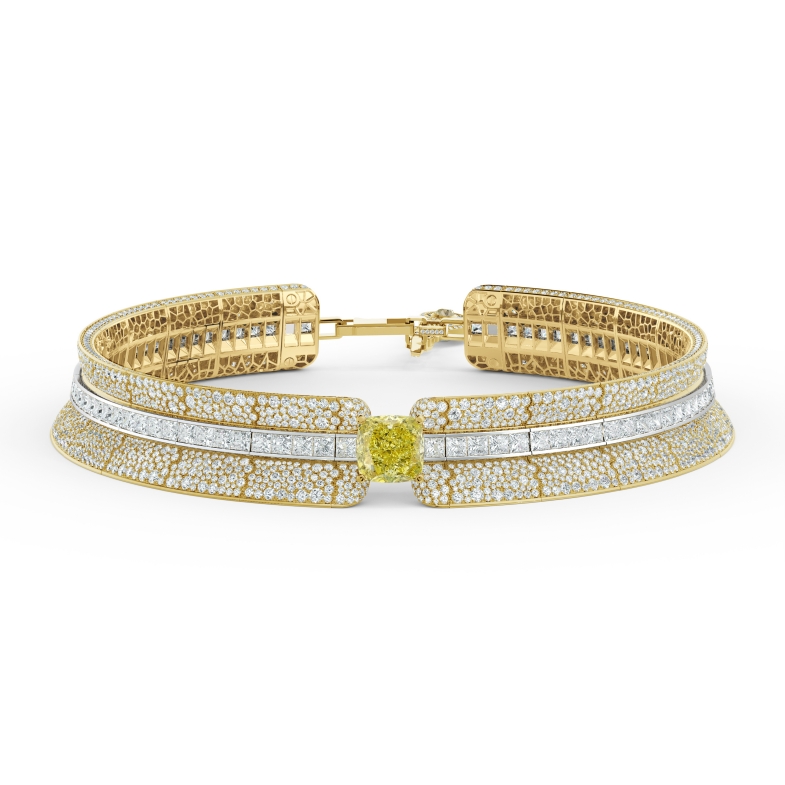 高達9.06克拉的枕型切割濃彩黃鑽座落於中央,被18K黃金與白金包圍著,並以鮮少出現於精品珠寶的Chocker形式設計,完美貼合配戴者肌膚,襯托出整體珍貴非凡的氣質。