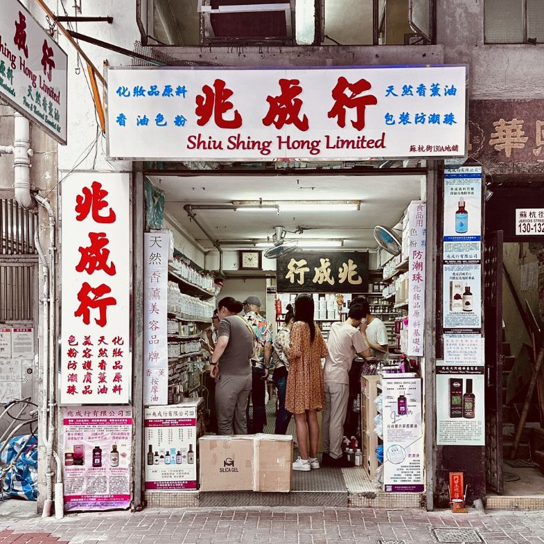 上環蘇杭街的「兆成行」至今已經營業60 多年,保留著非常有年代感的店裝,白底紅字的大招牌讓人聯想到中藥行,店內像雜貨一般擺放著香薰油、按摩油、基底油、等化妝品、美容用品的原料。來自於世界各地的精油種類齊全,加上非常有優勢的價格,讓「兆成行」成為了香港在地人口耳相傳的美容名鋪!