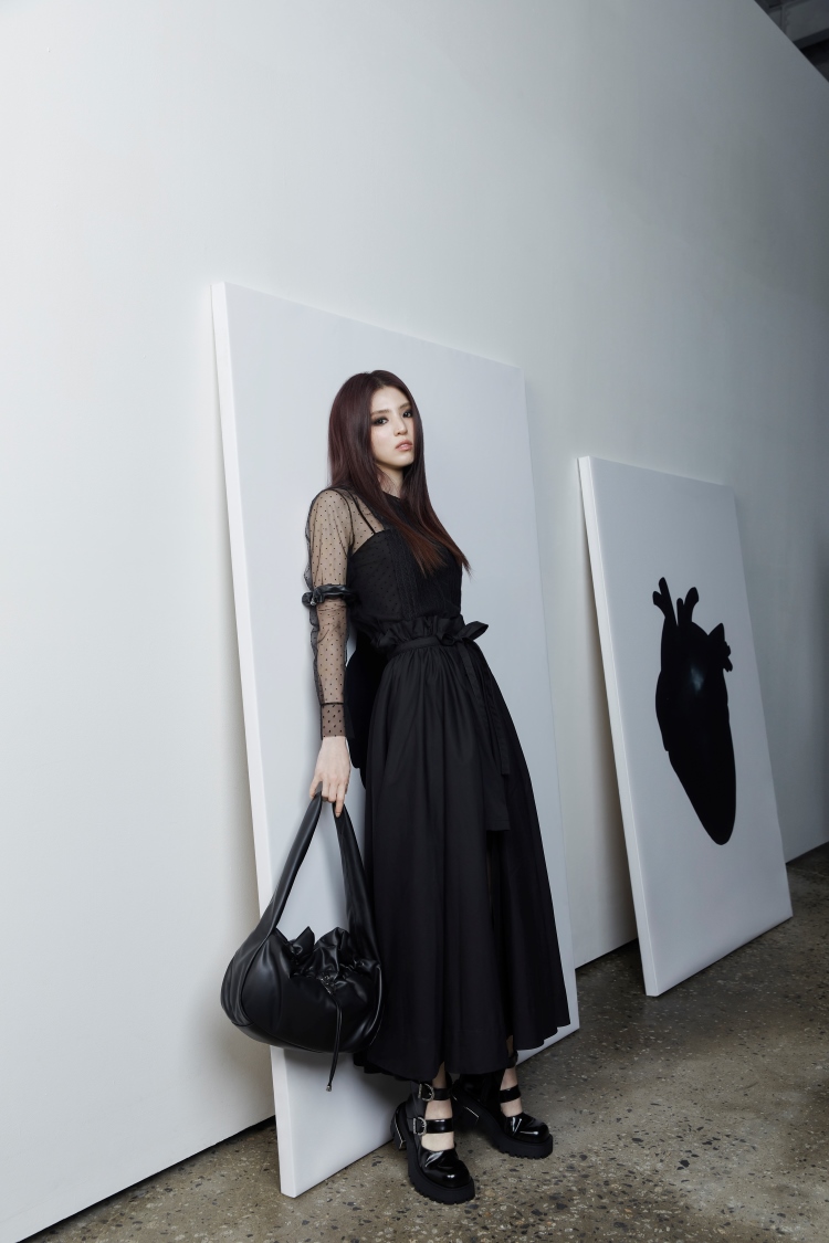 Charles & Keth全球品牌代言人韓韶禧,一直以來以多變的時尚風格為人所知,不管是如千金小姐般的氣質甜美,或是畫上煙燻妝展現帥氣的面貌。這次搶先穿戴本次的聯名鞋包,三件黑色系單品,完美呈現了現今最熱門的酷甜女孩風格!浪漫氣質的束腰長裙,搭配上帶有瑪莉珍鞋元素的心臟鉚釘厚底靴,手上抓皺感的軟質抽繩包,在暗黑叛逆的氛圍中又帶有甜美的女人味。