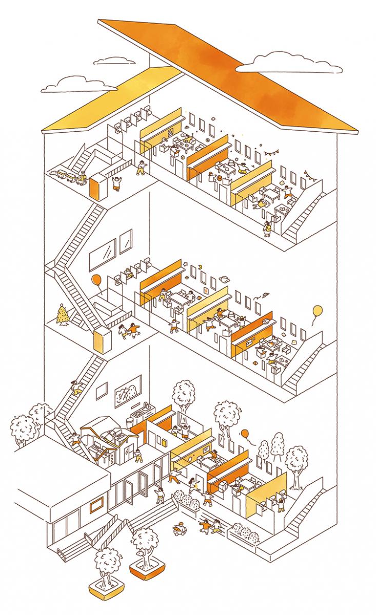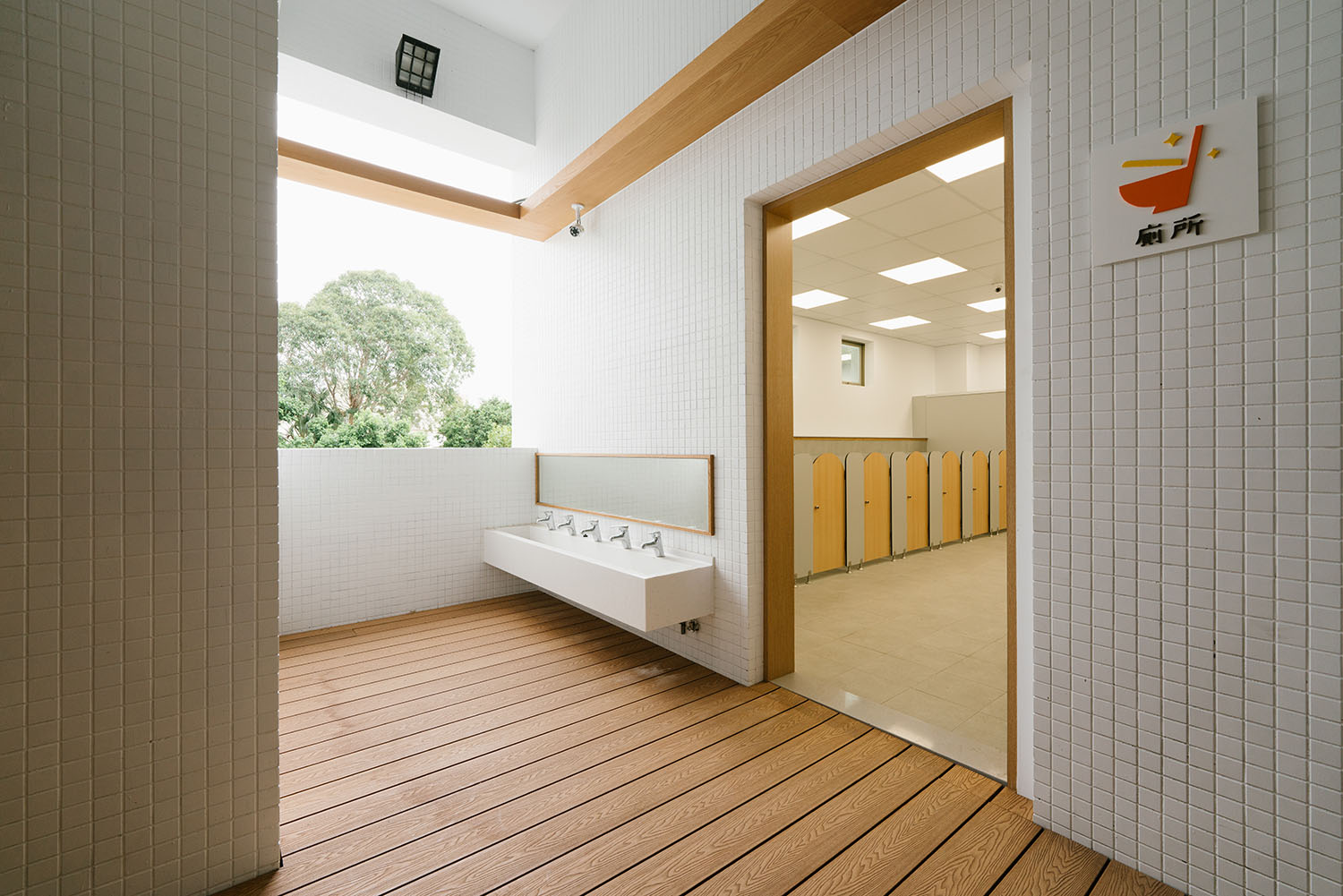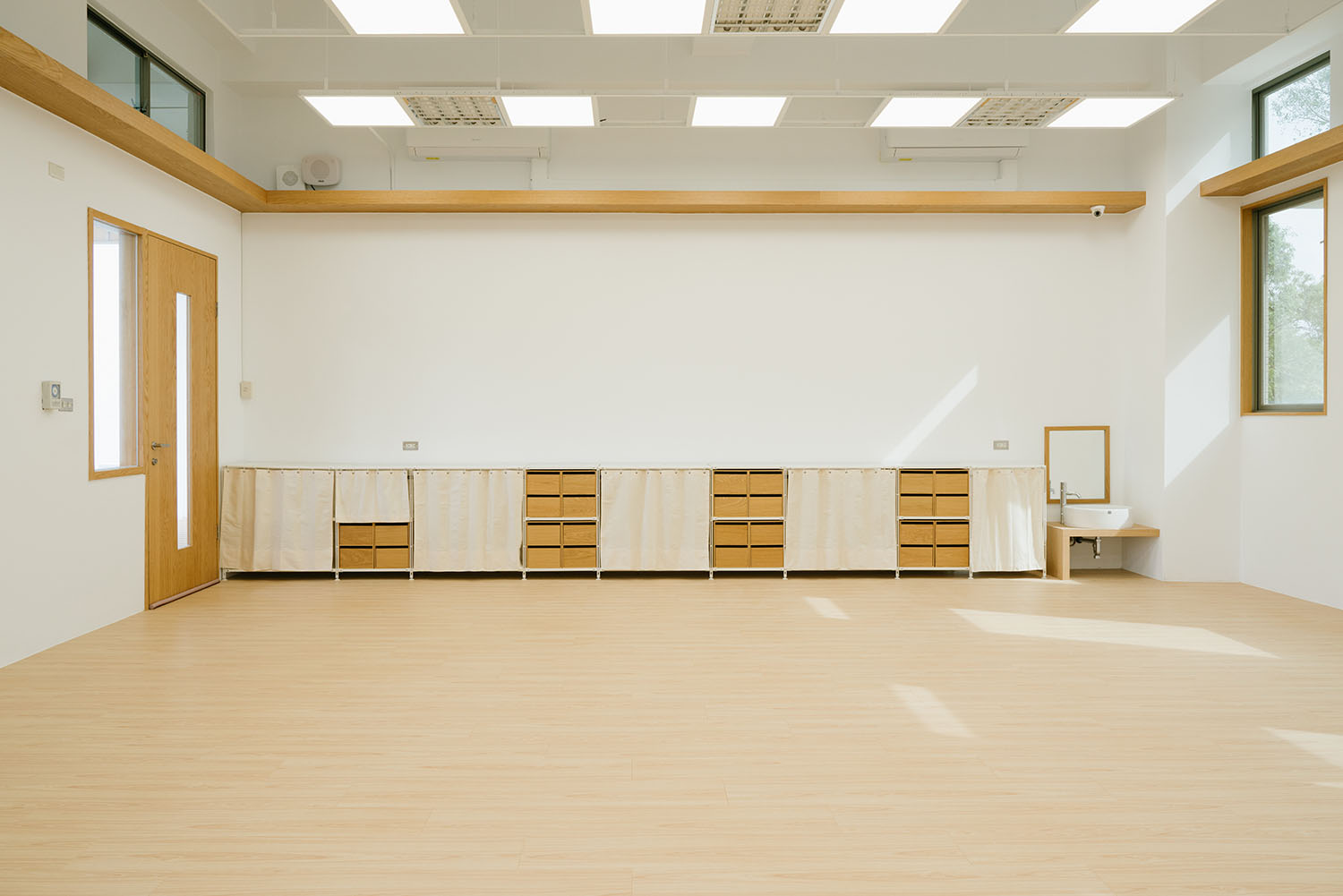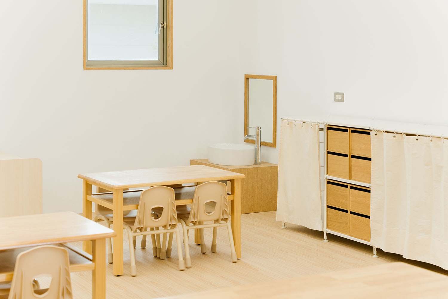 量身打造的桌椅、洗手台,靈活收納的層架系列,藉由木材、白牆、暖光,打造出一種像「家」的幼兒園,傳達 MUJI 空間設計的主軸:幼稚園是讓孩童成長的場所,亦是靈魂滋養與休息的空間。唯有如此,才能讓孩童快樂地長大。