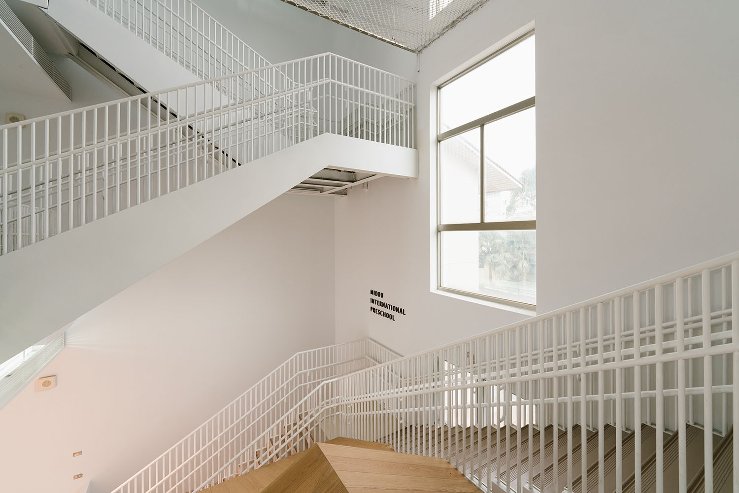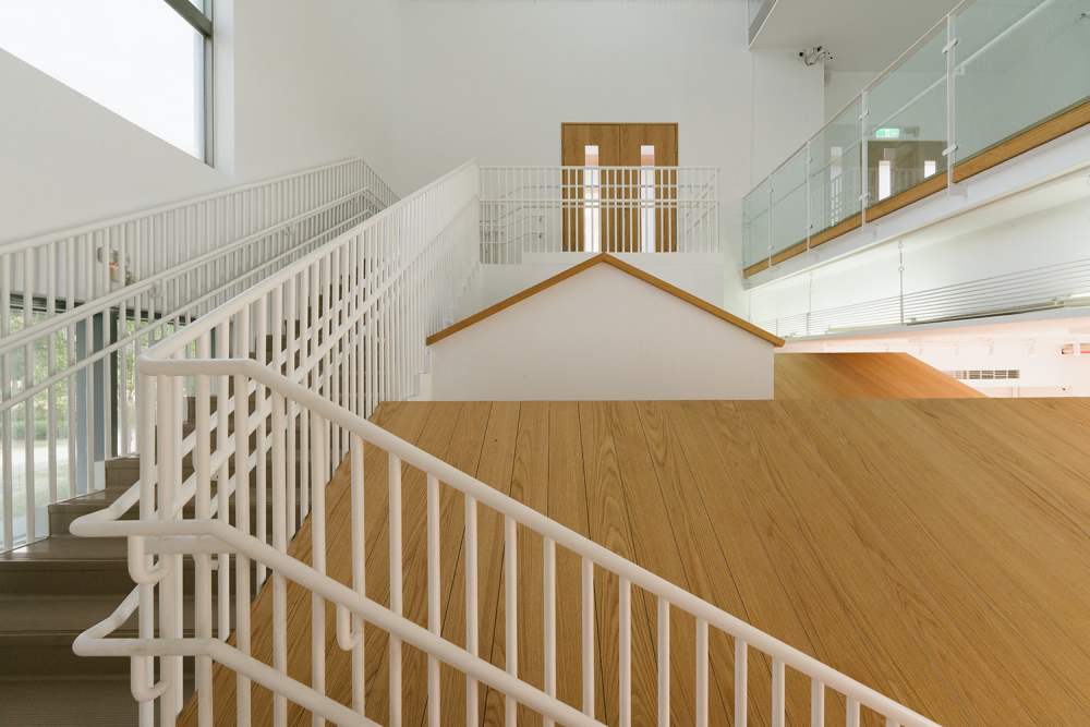 在 400 坪的室內樓地板面積上,MUJI 空間改造團隊透過上下層樓板、串連起空間的使用性,欄杆的設計也變得更加緊密並且加高,以此提高孩童的安全性,加寬台階深度、降低台階高度,讓孩童上下樓變得更輕鬆。潔白樓梯、通透的採光窗,讓內部的動線變得格外清晰,享受上下樓梯的過程,而不只是抵達。