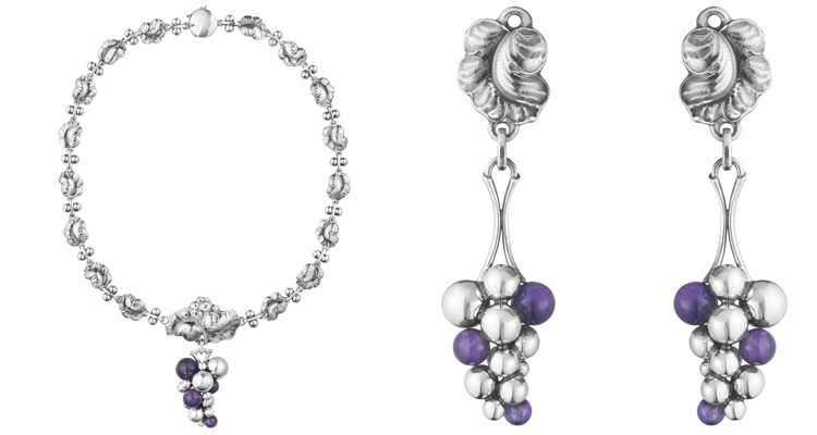 今年的耳環及項鍊訂製款,則是鑲嵌上溫潤爾雅的紫水晶,並結合上尺寸大小各異的銀珠,擬真出葡萄果實樣貌,耳環墜飾上方配以硫化純銀材質所打造的立體葡萄藤葉,寫意的廓形,也再次呼應了喬治傑生深具自然的活力生機與純粹之美。(項鍊,NT$ 64,600;耳環,NT$ 25,000。)