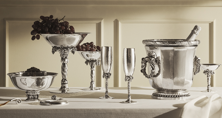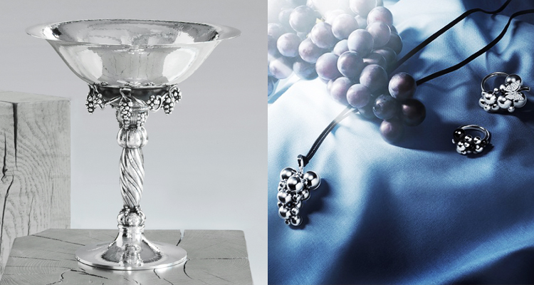 說起各品牌從大自然萬物中取得創作靈感一事,雖是業界的慣用手法,但喬治傑生對於自然元素的運用就是特別的別出心裁:純淨、有機,並富有強烈型體的造型。他可以讓作品看來就像是清澈的水流一般,卻彷彿又能凝結在時間的瞬間,使其能展現出超越時空的設計之美。就好比強調手工雕刻藝術、有著“葡萄藤裝飾”為主的高腳器皿及各式缽體,正是這位傳奇銀雕大師的招牌之作!