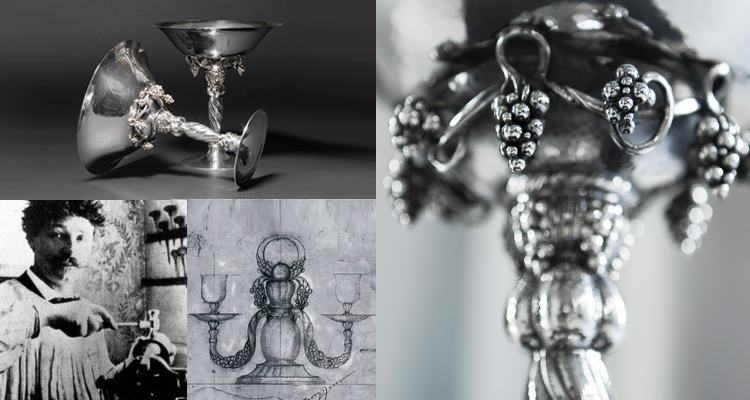 裝飾曲線、有機結構、植物雕飾、高腳的設計如葡萄藤般往上蔓延,以纍纍的葡萄果實襯托簡約的缽身,讓銀質大面積地反射優雅的柔暈光澤、用來裝盛佐酒的食材可增添品酒氛圍與情調…此系列的銀雕容器最早以葡萄為主題所設計的,隨著時代演變、消費者使用習慣的改變,才逐漸發展出一系列具有該細節元素的燭臺、餐桌擺飾及酒杯,甚至是珠寶。