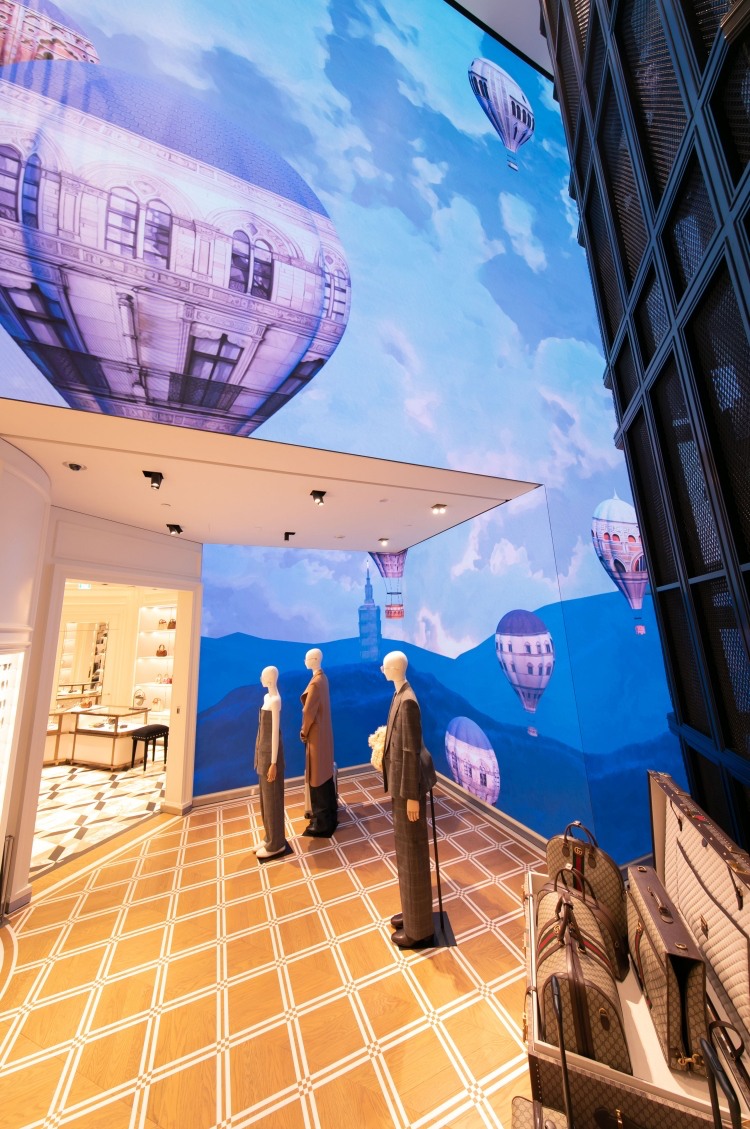 一走進到店內,除了服裝、包袋之外,最令人眼睛為之一亮的,莫過於高達10公尺的LED藝術牆,更是用心的是當中的動畫設計,「全球唯一」只在這裡可以親眼見證。靈感是結合品牌發源地佛羅倫斯的聖母百花大教堂,還有台灣在地DNA的天燈。藍天時會飄著有教堂外觀的熱氣球,直到天色漸黑轉換成一個個冉冉升起的天燈,彷彿佛羅倫斯、台北只在一線之間。