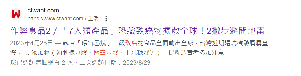 又或是這篇旺台媒體的摘要,看起來是說關華豆膠致癌,點進去會發現根本是在說環氧乙烷致癌,跟關華豆膠一點關係也沒有。