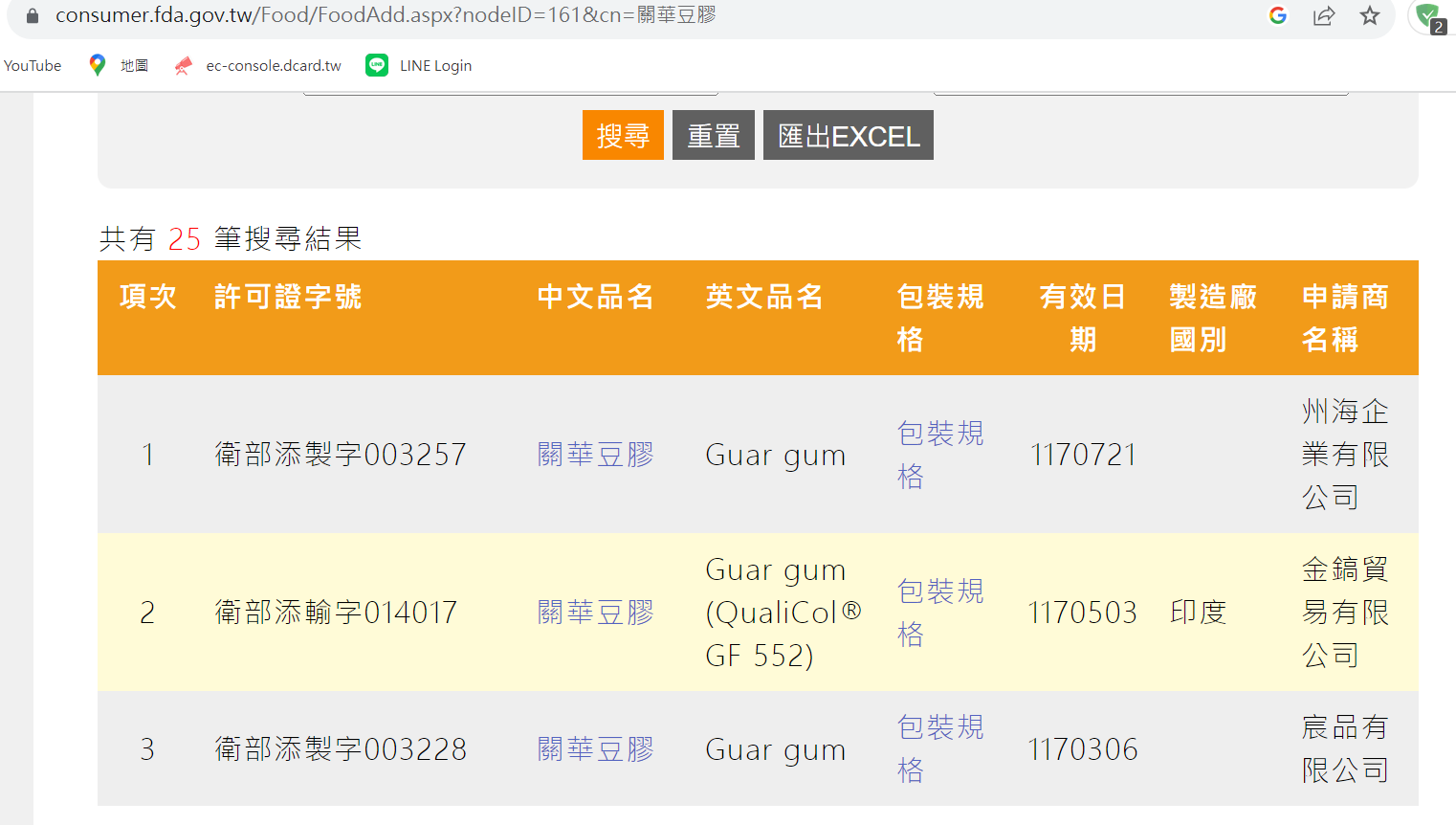 另外,為了更有公信力,我們也使用官方資料庫查詢,讓官方來證明這項關華豆膠致癌是個謠言