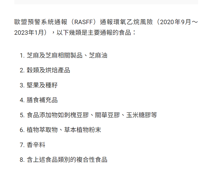 乍看之下以為是這幾項食品有通報致癌危險,但意思是上面八項品類要注意可能會被添加環氧乙烷,但食品本身是沒有致癌風險的。