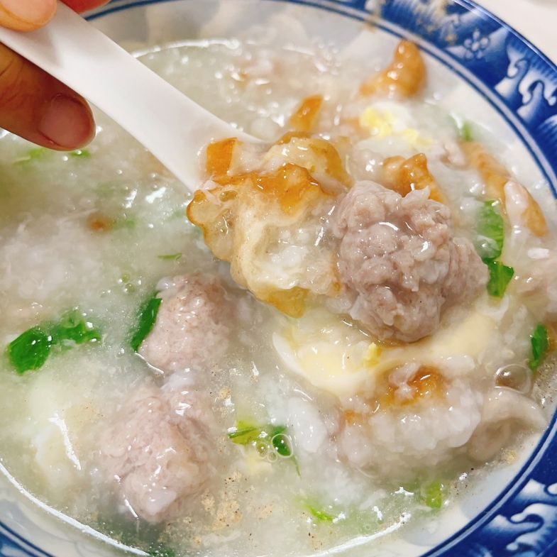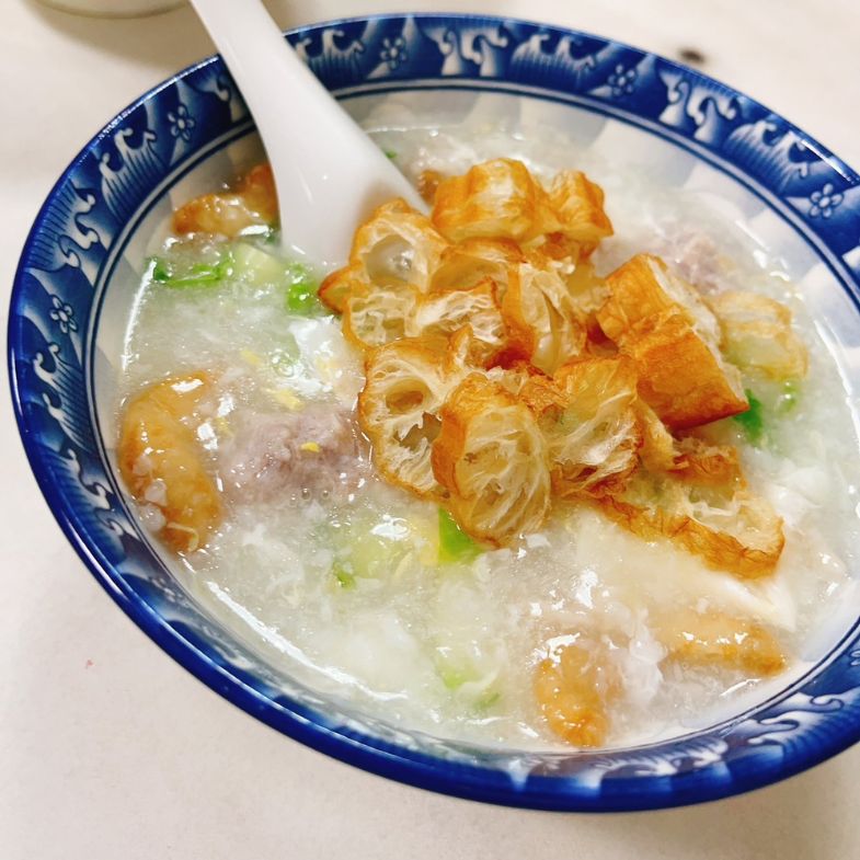 金門廣東粥的特色是用大骨和米去熬成米湯質地的粥糜,米粒已經消融在濃稠的湯,口感上其實有點接近羹湯。他們家的廣東粥口味清淡宜人,像一碗上好的大骨高湯,裡面的配料也是其他地方少見的豐富:肉丸、魚酥、油條、瘦肉絲和青菜,都是老闆手工製作,口感和味道都沒話說!儂編特別喜歡上面的油條,不會過老過脆,是很有嚼勁的那一派油條,搭配著清淡溫潤的米湯,一杓一杓吃起來實在是一大享受。