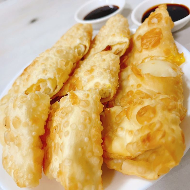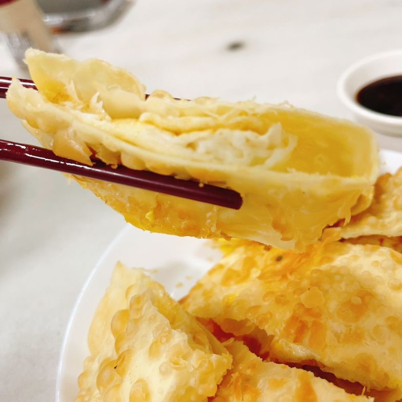 廣東粥份量並不大,一直以來都是一碗粥、一份蛋餅這樣點,搭配倒是剛剛好。不過只想要來單吃蛋餅的人可能要碰壁了,老闆堅持他們家的粥和蛋餅不可分開,一定要點粥才能買蛋餅。這種蛋餅其實儂編幾乎沒有在外面看到過,酥脆的外殼,口感介於燒餅和乳酪餅之間,嚼起來油香十足,蛋餅樸實的包著半熟蛋,吃起來燙呼呼的又香又涮嘴,再沾上店家特調的蒜蓉醬油膏,帶一點辣味讓人回味無窮。
