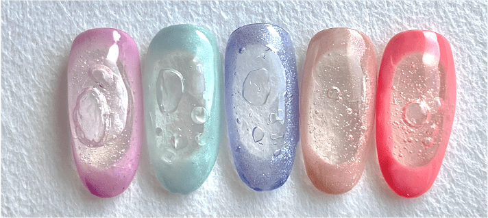 今年的美甲市場在用色上更為大膽、活潑,不只多巴胺色系、芭比風潮席捲全球,在日本這兩季至初秋還發展出一款可愛的款式「泡泡美甲」!落合佳代老師點出,初秋很推薦選擇偏粉色調、具透明感、或是帶有一點亮片質感的亮色系,並且使用使用軟糖膠、建構膠或泡泡膠製作出泡泡質感;最後,將製作好的泡泡安裝於指尖,款式簡單、快速又清新搶眼。