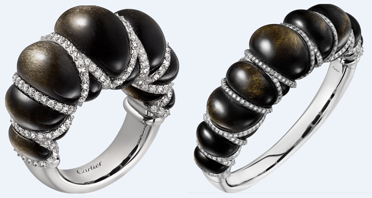 卡地亞突破表像,將金和寶石等…硬材質幻變為柔軟而充滿生命力的造型,首先是卡地亞攻克黃K金工藝上的雙重限制,包括本身的規律凹槽及束縛它的鋪鑽細鍊,從而突顯立體造型;再來則是,其中一款上頭的黑曜石,因閃耀著獨特的虹彩光芒,為加強這種奇妙的光澤,特以凸圓形切割表現之,以精湛技術、工藝成就此美學設計。
