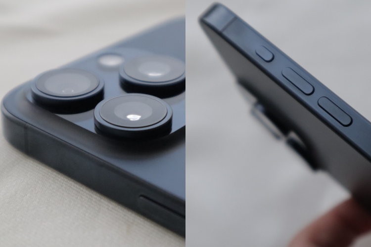 號稱最美iPhone的15 Pro Max使用鈦金屬色,儂編本次實測的是藍色,與上一代iPhone14 Pro Max相比之下,明顯在質感部分有很大的提升,邊框則更細緻化做了更順手的弧面設計,重量與上一代相比確實很明顯輕很多。而果粉最害怕的鏡頭越做越凸毛病,則不需要擔心,雖然相機大幅提升很多,但在鏡頭玻璃部分則比上一代薄很多,外觀上也能看見這次新增的全新按鈕。
