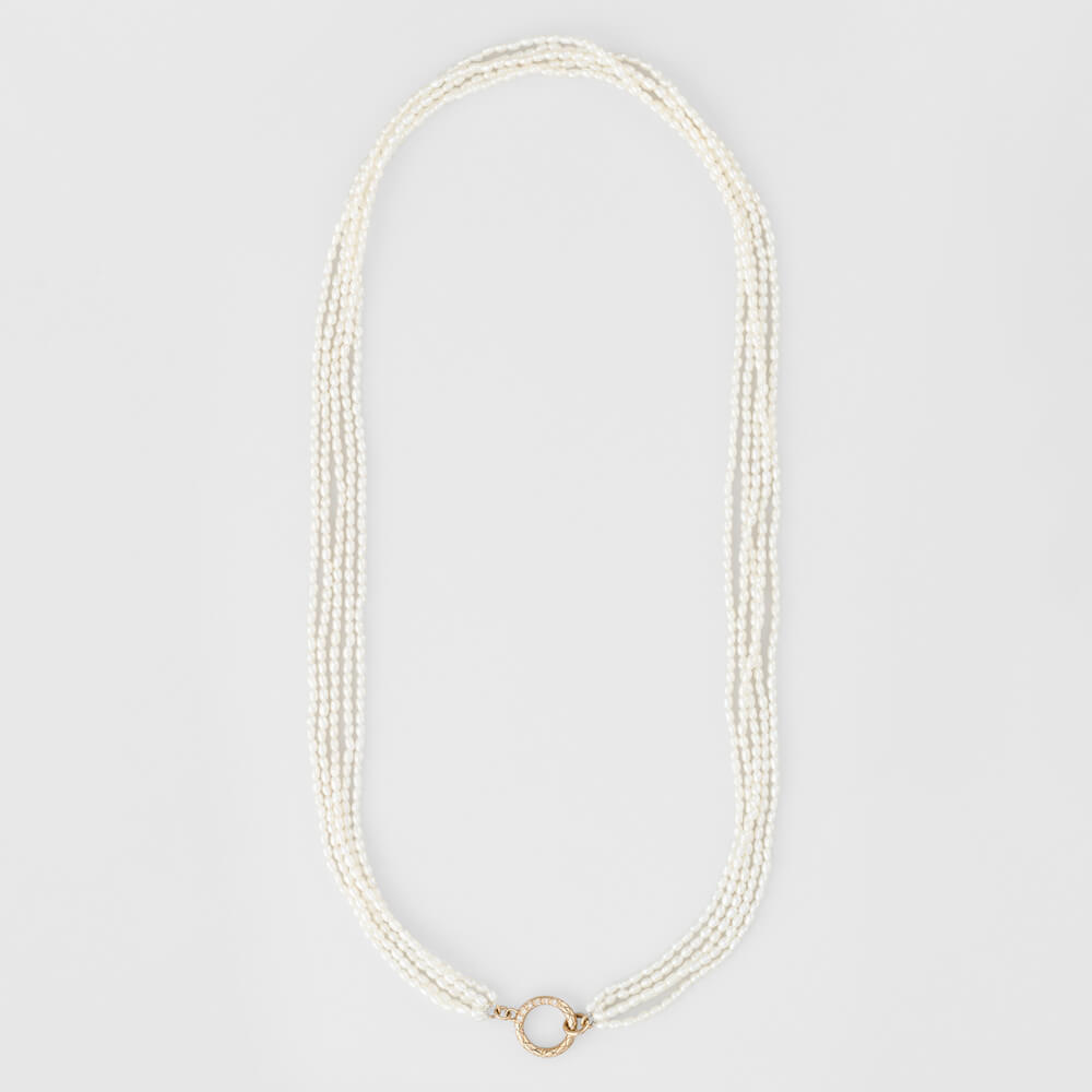 像是古董珠寶一樣的華麗的珍珠項鍊,由五排小顆珍珠組成,每顆珍珠大小均勻。圈形扣頭上鑲嵌著鑽石,更添耀眼光芒。是一副非常有份量感的首飾,在重要場合搭配更顯古典莊重。(官網建議售價:NT$37,500。)