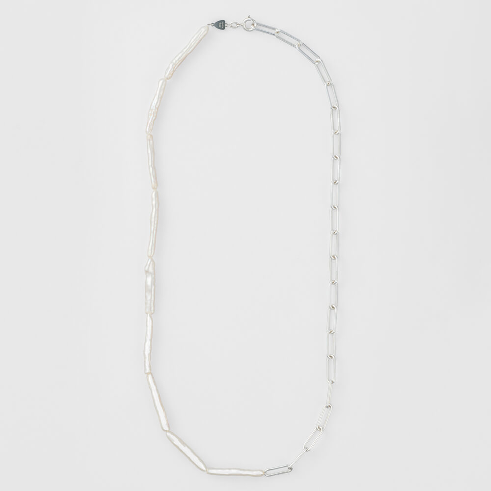 珍珠沒有你想的那麼無聊,挑選柱狀的珍珠碰撞銀色鍊條,就能打造出截然不同的率性感!推薦與金色項鍊一起配戴,也適合與復古銀項鍊疊搭,時髦又充滿現代感,就算只是穿著T-Shirt 和牛仔褲配上這一條項鍊也能完美消化。(官網建議售價:NT$8,500。)